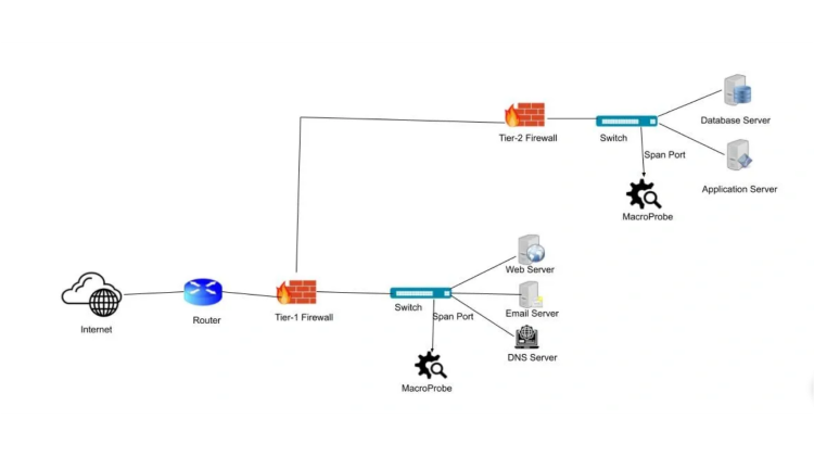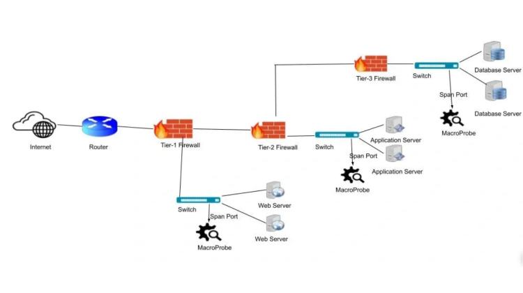 NETWORK, SERVICE AND CYBERSECURITY MONITORING FOR 3-TIERS DATA CENTER USING THE MACROPROBE + CYBEROBSERVATION APPLIANCE.